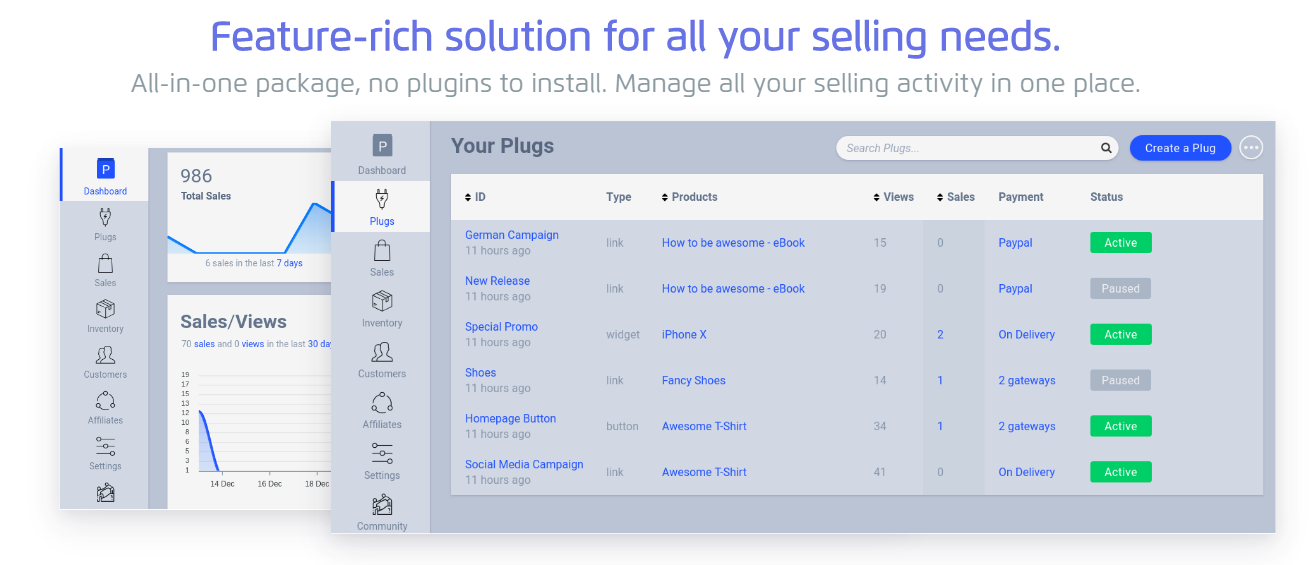 Plug&paid is a shopping cart platform that helps you monetize your website or social media page. The software uses a distributed approach that adds hosted buttons, links, and widgets called ‘plugs’.  This method requires no redirecting and it is very easy to install on your page using copy and paste.
